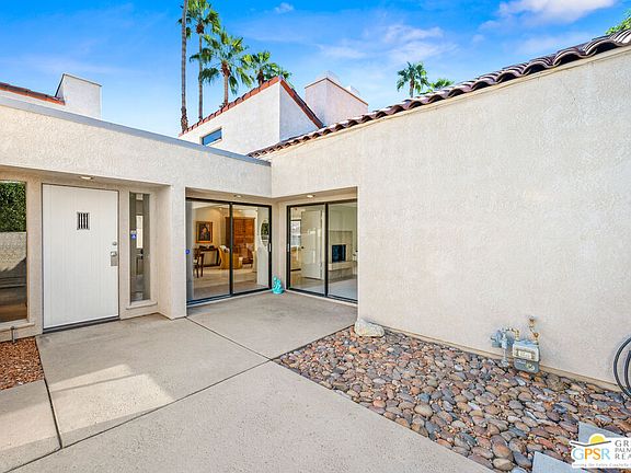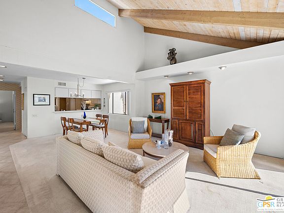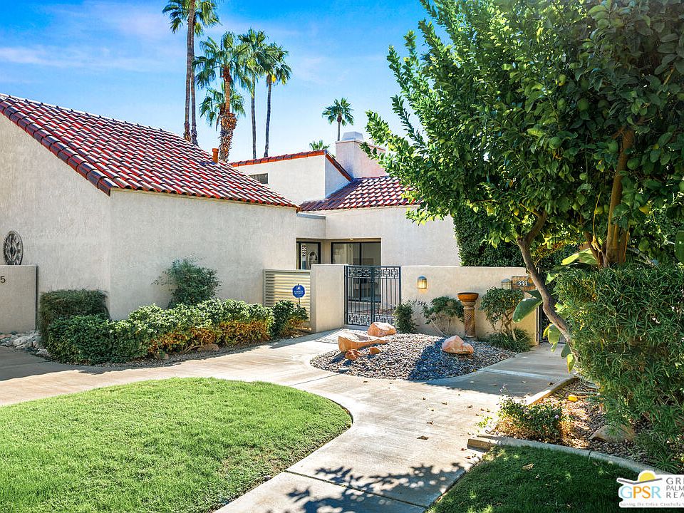 Desirable Mission Hills condo located in the "Racquet Club Estates HOA" perfectly situated for mountain and greenbelt views. The single-story residence, with vaulted and beamed ceilings, allows an abundance of natural light throughout and lends a spacious open feel. Two bedrooms, on opposite sides of each other, both feature vaulted ceilings and en-suite bathrooms; The primary suite offers dual separate vanities, bathtub and a gas fireplace. This model has a private gated courtyard and a rear southwest facing patio that opens onto a green belt. Mission Hills Fitness Center, tennis and pickle ball courts are all within walking distance. Mission Hills Country Club offers many variations of membership levels to enjoy all the amenities the community has to offer. Welcome to Rancho Mirage! Why aren't you living here yet?