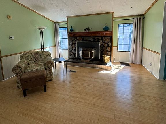 From the time you pull into the driveway, you will feel the serenity and peace this home offers. 2.5 acres of wooded land surrounds this home. Enough land to subdivide if you choose. Across the steet from Lake Sinclair and surrounded by lovely homes. Enter the home through a mud/laundry room. A cheerful kitchen/breakfast nook welcomes you. 3 bedrooms with walk-in closets, 2 spacious baths provide ample comfort. Split bedroom design with primary bedroom separated from 2 bedrooms by oversized, open living room with pellet fireplace. Enjoy a cup of coffee on the front porch surrounded by nature or in front of the pellet stove (48 bags of pellet fuel included). This property has been well maintained and loved. The flooring is like-new, and walls are in good shape and tastefully painted. Whether you need to park 4 vehicles or a hobby shop, this property comes with a 24x34 metal garage. This home is a beautiful place to make family memories. All furnishings can remain with the property. All appliances included.