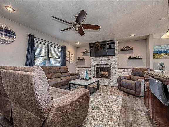 Large storm shelterFenced backyardOpen-concept floorplanSpacious primary suiteTile in the kitchenStainless appliancesWhite brick fireplace