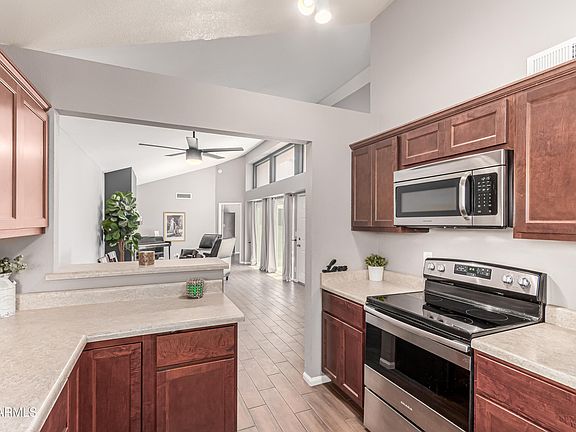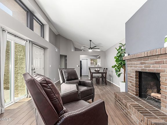 This amazing updated 3 bed, 2 bath home is ideal for anyone craving low-maintenance living with just the right amount of charm. Vaulted ceilings, great natural light, and a cozy wood-burning fireplace make the space feel open and inviting. Step out to your private patio—accessible from both the living room and primary suite—perfect for your morning coffee or winding down under the string lights. Recent updates include a newer roof and patio sliders (both 2020), plus an attached 2-car garage for extra storage. You'll also enjoy access to the community pool and BBQ area. Tucked away but close to it all, you're just minutes from Dana Park, top-rated dining, shopping, and easy freeway access to Mesa, Gilbert, Tempe, and Sky Harbor. This home is move-in ready and made for your lifestyle.