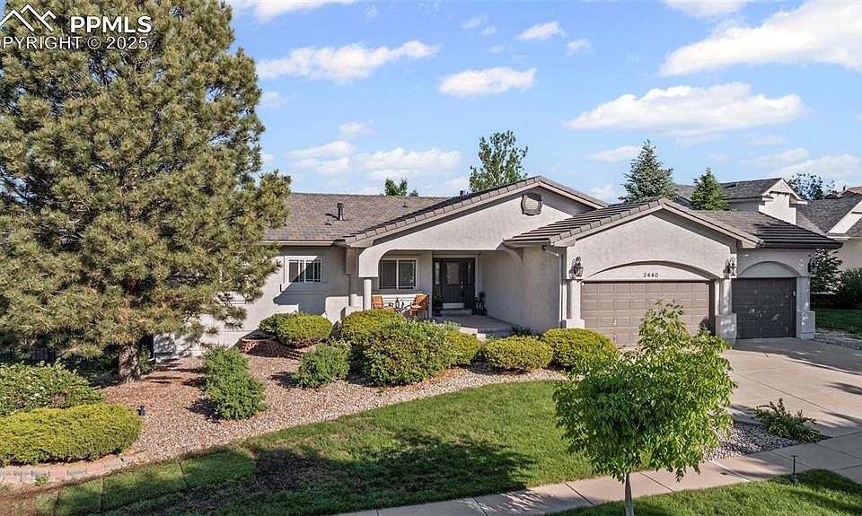 Welcome to your dream retreat in this exquisite 5-bed ranch-style home that offers sweeping mountain views of Pikes Peak and the Front Range from both levels, a walk-out lower level, and backs to a protected wildlife habitat. Nestled in D20's Pine Creek, this home has it all. Step onto the covered front porch, shaded by mature trees, and breathe in the quiet beauty of your surroundings. Inside, you’re greeted by 12ft vaulted ceilings, rich engineered hardwood flooring, and light pouring in through floor-to-ceiling windows that frame the mountains like artwork. The open-concept main level centers around a stunning stone gas FP and a spacious living area and dining room that flows seamlessly into the gourmet kitchen. Here, white cabinetry, granite counters, stainless steel appliances, a walk-in pantry, and stylish backsplash create a kitchen that’s as functional as it is beautiful. A cozy dining nook leads to one of 2 decks—perfect for morning coffee or evening stargazing. The primary suite is a serene haven with a spa-like 5-piece bath featuring dual sinks, soaking tub, and walk-in closet as well as direct access to the main composite deck. A second main-level bedroom, full bath, office, and laundry room complete this level. Downstairs, the walkout basement opens to a massive rec room with a second gas FP, wet bar, and French doors leading to a peaceful covered patio. 3 oversized bedrooms, all with walk-in closets, a full bath, and a huge storage room round out this versatile lower level. Every corner of this home has been thoughtfully updated: Class 4 tile roof (2024), composite deck (2023), Central AC, new paint, central vacuum system, Smart thermostat, whole-house humidifier, and a finished, heated/cooled 3-car garage. Outside, enjoy a fully fenced rear yard and a setting that feels a world away—yet you're just minutes from Pine Greek Golf Course, UCHealth and Children’s Hospitals, Lifetime Fitness, Venezia Park, The Promenade Shops, Air Force Academy, and I-25.