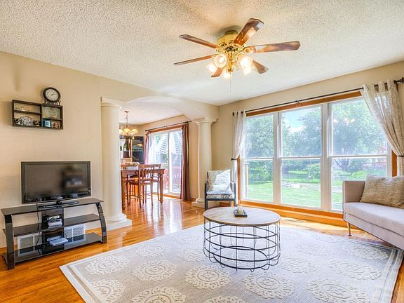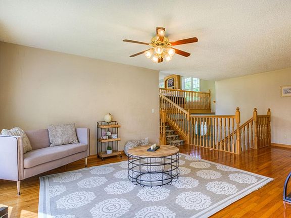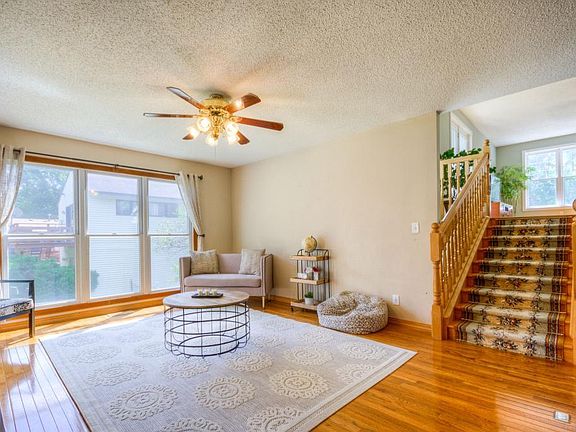 Stunning Brooklyn Park 4 level split style home. This freshly painted home features a great room built over the garage with it's own balcony, two entire floors with all hardwood flooring, newer lighting, and 2 additional living rooms.The updated kitchen features builder grade cabinetry with granite countertops and a large peninsula breakfast nook. Tiled floors in the kitchen and both full bathrooms. 3 bedrooms on one level in this home complete with solid wood 6 panel doors. This home is located on a extra large corner lot with 2 storage sheds and a patio.