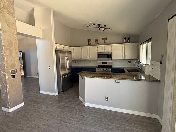 Swimming poolModern light fixturesDesert landscapeMountain viewNew stainless steel appliancesCorner lotVinyl floor