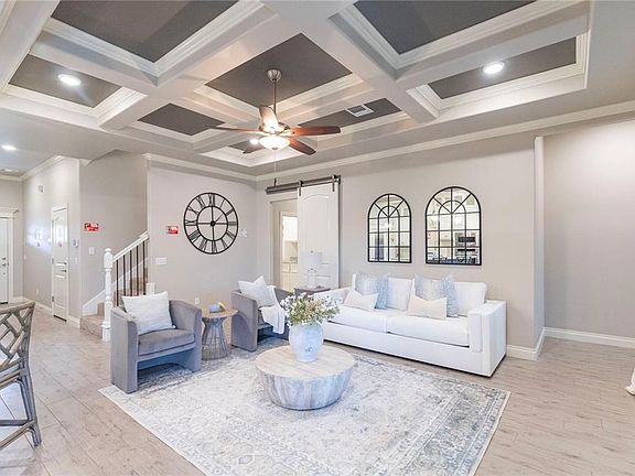 The lovely home is available in the Waters Community. This defining home offers 4 bedrooms, 3 bathrooms, 2 covered patios, a utility room, and a large bonus room located on the second level. The spacious living room features a stunning coffered ceiling, a stacked stone surround center gas fireplace, wood-look tile, and large windows. The high-end kitchen supports custom-built cabinets to the ceiling with glass and lights in the uppers, impressive tile backsplash, built-in stainless steel appliances, a bat-winged island, impeccable pendant lighting, a walk-in pantry, & 3 CM countertops. The primary suite offers a tray ceiling detail, windows, a ceiling fan, our cozy carpet finish, & 2 separate walk-in closets. The attached primary bath features separate vanities, a Jetta Whirlpool tub, a private water closet, & a huge walk-in sauna shower! Bonus room features additional A/C and lighting. Property is fully sodded with an in-ground sprinkler system in both yards and fully fenced! The covered back patio offers perfection with its wood-burning fireplace, gas line, & TV hookup. Other amenities include Healthy Home technology, a tankless water heater, a whole home air filtration system, R-44 Insulation, & more! Home has in ground storm shelter and blinds!