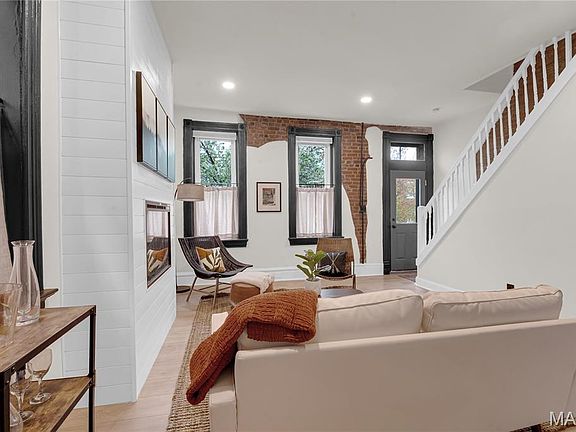 Blending timeless South City character with modern functionality, this fully renovated two-story brick home offers a rare mix of historic detail, open design, and stylish upscale finishes throughout. Step inside to find soaring ceilings, exposed brick accents, new vinyl plank flooring, a sleek modern fireplace, and custom built-ins that add warmth and personality. The open-concept main level flows naturally between the living, dining, and kitchen areas—ideal for entertaining or everyday comfort. The kitchen features stainless steel appliances, crisp white cabinetry, and generous counter space.