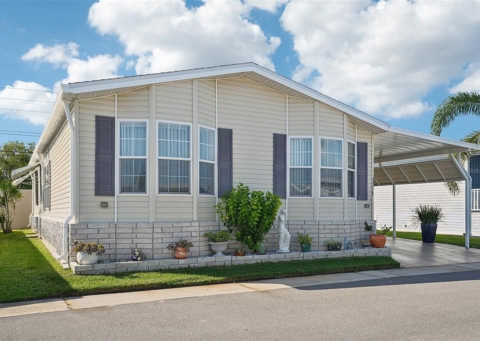 Get ready to fall in love with this spacious, beautifully appointed 3 bed, 2 bath home nestled in vibrant Sunset Palms, a highly sought-after 55+ community right here in Pinellas Park, Florida. Built in 2007 and boasting a brand new roof in 2023, this home combines modern convenience with comfortable, easy Florida living. The heart of the home is truly a chef's dream kitchen. You'll find an abundance of storage and workspace, anchored by a fabulous peninsula that flows seamlessly into the dining area—perfect for entertaining or casual weeknight meals. The vaulted ceilings throughout the main living area create an expansive, airy atmosphere, complimented by an incredible amount of natural light that streams in through the abundance of windows. The split bedroom plan offers privacy and comfort for both you and your guests. The primary suite is a true retreat, featuring a well-appointed bathroom with a modern walk-in shower and a double vanity. Your guests will feel pampered in the second bathroom, which features a luxurious jacuzzi tub—a wonderful place to unwind after a day of enjoying the Florida sun! You'll never run out of room for your hobbies or collections. This home features a versatile sunroom—currently utilized as a storage and walk-in pantry space—that could easily be a bright home office, reading nook, or hobby room. Outside, you'll find an oversized carport offering ample covered parking, as well as a large, dedicated storage shed for all your tools and toys. This is more than a home; it's a lifestyle. This golf cart-friendly 55+ community is full of activity, featuring fantastic amenities like a sparkling pool, fun shuffleboard courts, and an onsite management office for peace of mind. Don't miss the chance to secure your slice of paradise in Pinellas Park. This gem won't last long, call today for your private showing!