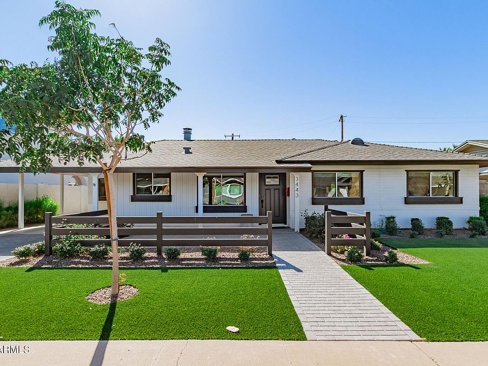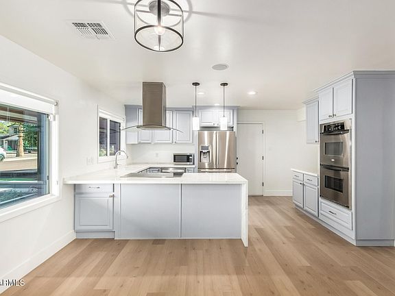 Perfect family home. Remodeled 4 bedrooms and 2 bathrooms. Great open floorpan. Modern remodeled kitchen w/quartz countertops, stainless appliances including double wall ovens, peninsula seeting and modern lighting. Living room is large with dining area and gas fireplace with surround sound throughout. Bedrooms are split with three on one side of the house. Large bedroom with ample closet on the other side of the house. Front yard beautifully redesigned with nice patio. Resort like backyard with pool and large covered patio. Turf front and back with low water plantings. Sought after family neighborhood located in Biltmore/Arcadia area. Walking/biking distance to some of Phoenix's best restaurants and shopping. Great schools. 15 minutes to downtown Phoenix, baseball, basketball.