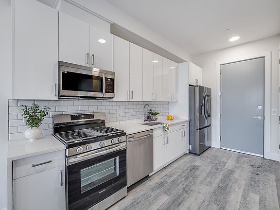 This unique residence hosts a spacious layout with incredible views. The modern interior is finished with clean design and upgraded elements like Katella ash floors and a walk-in closet. Kitchens offer white quartz counters, tile backsplash, and Samsung stainless steel appliances. Stackable in-unit washer and dryers add to lifestyle and convenience.