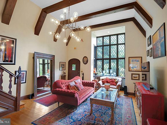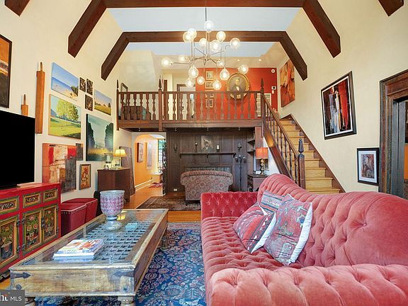 Showings begin Saturday, October 11th, at the open house from 12pm-1pm. Immediately upon approaching this home, you are greeted by its charm, feeling like you've stepped into a fairytale. A lush garden of mature perennials frames a stone path to the solid wood arched front door, welcoming you home. This Tudor home has been lovingly maintained and is protected by designation on the historic register, preserving this and the surrounding blocks' timeless appeal. The stone facade, timber trim, solid wood door, and oversized glass pane windows invite you in. Enter into a spacious living room with soaring ceilings, sun-splashed with natural light. This two story space offers a dramatic balcony overlooking the room, which showcases the architectural elements and fine woodwork, framing the ceiling with exposed beams. A wood burning fireplace and mantle offer cozy warmth. This space graciously accommodates all kinds of furniture configurations, and an added hidden remote-powered television mount tucks the TV away when not in use, welcoming entertaining. Enter into the kitchen and dining area to find a modern chef's kitchen with granite counter tops, warm cherry cabinetry, and a full suite of stainless steel appliances, including dishwasher and induction cooktop. The dining area offers a breakfast bar for everyday convenience, corner nook seating, and room for a formal dining table. Off the kitchen, find the first access to the rear of the property, where you'll find the oversized garage, additional dedicated street parking space, and a separate outdoor patio area surrounded by lush trees, perfect for dining al fresco in the warmer months. Downstairs, find a fully finished lower level. No expense was spared on transforming this space, which also walks out to the rear of the property with its own additional exit/entrance - perfect for a gym, office, playroom, or au pair or guest/in-law suite, complete with its own elegant full bath. A custom-built glass-walled enclosed space offer endless possibilities for both work from home or hobby pursuits, and built-in storage abounds. A separate laundry area completes this beautifully finished space. Upstairs, take the grand staircase up to your second floor, where you'll find your primary suite with an ensuite fully renovated marble bath with walk-in shower and skylight, as well as heated floors for added comfort. Step out from the primary bedroom to an expansive deck, perfect for your morning coffee or an evening drink to unwind in your own private retreat. Take the stairs up to the third floor to find two additional well-proportioned bedrooms and a full bath off the hallway, with classic black and white tile and fixtures. The rear of the property is accessed from the street's own private alley, which is beloved by the neighbors for gatherings. This garage is significantly wider than others, and comes with an electric car charger already installed. Radiant heat, as well as a central air system has been recently updated, are efficient and effective. This prime East Falls location puts you within walking distance to the Falls of Schuylkill library, multiple parks including nearby McMichael park, walkable access to the trails of Wissahickon, retail stores, fabulous local restaurants and and cafes, such as just up the block coffee shop and florist's greenhouse Vault & Vine. Quick access to Fairmount, Center City, University City, Chestnut Hill and the Main Line, as well as find local hospitals and universities a short commute away. Experience the convenience of city life with the charm of green space and a lovely neighborhood feel at this unique, beautifully cared for property.