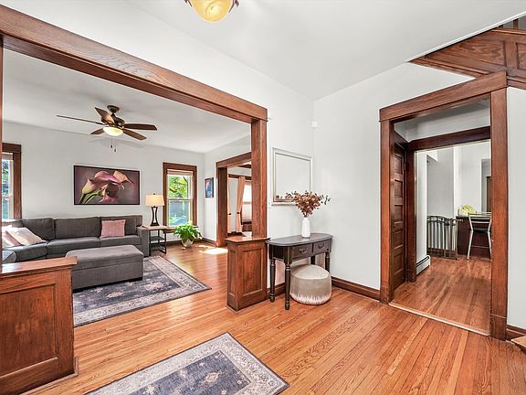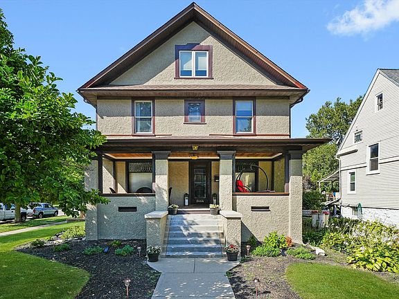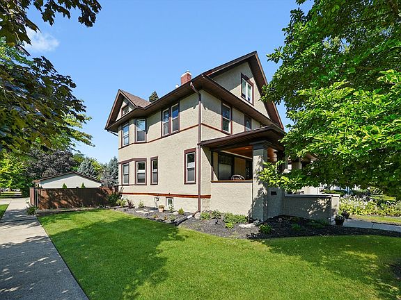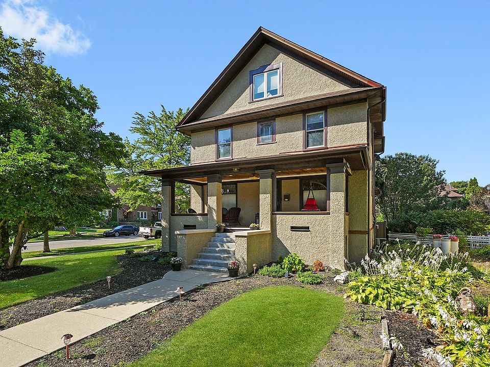 Charming American Four Square with Prairie-Style Influence in Berwyn, IL offering three levels of living space plus a basement, featuring 5 bedrooms and 2.5 bathrooms. The inviting front porch sets the tone for summer relaxation, while inside hardwood floors run throughout with an entry den currently used as an office. The main level includes a large living room, formal dining room, and an updated kitchen with stainless steel appliances, granite countertops, a breakfast peninsula, and abundant natural light from oversized windows and patio doors leading to the backyard. The second floor provides four generously sized bedrooms and a full bath, while the third level hosts the primary suite with en-suite bath and a convenient laundry closet. Original trims and a stained-glass window at the stairway highlight the home's character. The basement is partially finished with utility space and hookups for a second laundry room. Recent improvements include professional stucco restoration (2022), garage and home roof (2018), updated 100-amp electrical system, and vinyl privacy fence. Set on a double lot with one PIN, the property features professional landscaping, a 3-car garage, and 3 additional exterior parking spaces. Excellent location within walking distance to the Berwyn Metra Station, Loyola Hospital, local shops, and seasonal festivals in Downtown Berwyn. One of kind opportunity near in the Berwyn's Depot District.