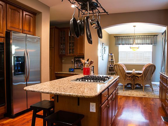 Enter this stunning firelight home to dramatic lofted living & formal dining rooms. Beautiful cherry wood flooring through most of main, family room w cornered stone gas fireplace wired for surround sound, plantation shutters throughout, gourmet kitchen with island with gas cooktop, double oven, stainless refrigerator, builtin work area with glass front cabinets, butlers pantry & additional storage, lofted 2nd story with library/office, large master with 5 piece bath with walk in closets has mountain & city views, huge flex room could easily be converted to 4th bedroom up or exercise room, currently used as an office, larger secondary bedrooms with shared full bath, professionally landscaped w built in stone walled gas firepit, large rock & beautiful trees along w flagstone & concrete pathways. Walk one house to Dry Creek Trail system, Copper Mesa Elementary just around the corner. Near shopping & restaurants. Award winning schools. Patio furniture and umbrella stays.