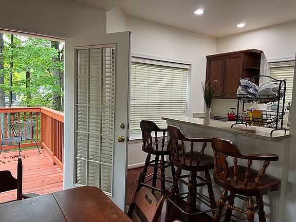 Two bedrooms (queen beds) on the top floor provide nice views of the neighborhood (and Fishing Creek during winter). The main entrance leads to the second floor, with an updated kitchen, half bath, living room, patio overlooking the backyard, and a fireplace. The lower level, accessible from the main floor or by its own private entrance, is set up as a spacious den with its own full bath. The sliding doors lead out to the shaded and fully-fenced yard.