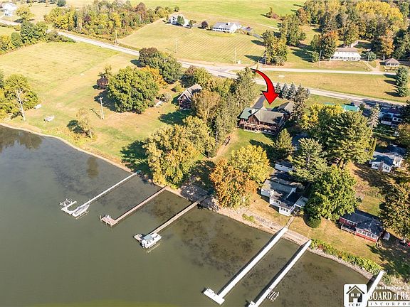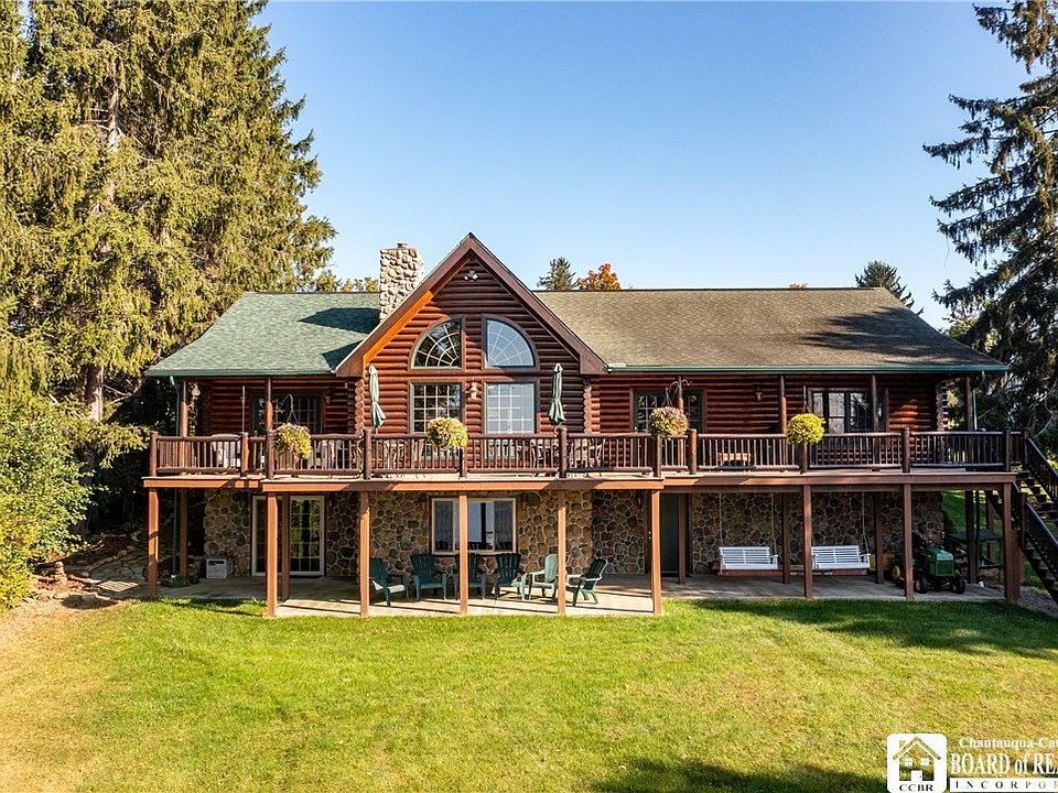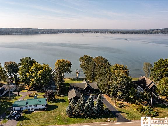 Nestled on the serene shores of Chautauqua Lake in Bemus Point, NY, this meticulously crafted log home is a true gem with superior craftsmanship and timeless design. It features 3 spacious bedrooms and 3 full bathrooms, all offering breathtaking panoramic views. Entering the foyer, you'll be captivated by the 20-foot cathedral ceiling in the great room with floor-to-ceiling windows that allow natural light to flood the space. The master suite, split floor plan privacy, includes a full bathroom and an impeccable view through sliding doors that lead to a 60-foot deck. This deck extends across the rear of the home, offering a perfect spot to relax and enjoy the scenic view of the lake. The large eat-in kitchen is equipped with brand new LG appliances and features a large island with a prep sink. Sliding doors provide access to the deck, making it ideal for entertaining. The dining room is perfect for all gatherings. Down the hall, you'll find two large bedrooms and a full guest bathroom. The home has a large first floor laundry room equipped with Maytag appliances, set tub, and plenty of storage space. The property includes a 36x24 3-bay garage with door openers, providing ample space for vehicles and storage. The area of this partially finished basement [approx. 900+ sq. ft.] is a haven for entertainment, featuring a built-in bar for countless celebrations and full bathroom. A cozy family room with a gas stove allows you to also enjoy the winter months while watching the snow fall over the glassy lake. Additionally, there's a room that can be adapted for a bedroom, den, etc. The Basement also offers a separate workshop with cabinets and work bench, plenty of storage space and large walkout man door. This property boasts 93 feet of lake frontage, complete with a custom 4-foot-wide dock. Enjoy evenings by the brick fire pit on the lake, where you can take in the full view of the Fourth of July fireworks display. Don’t miss your chance to own this exceptional property on Chautauqua Lake, where every day feels like a vacation.
