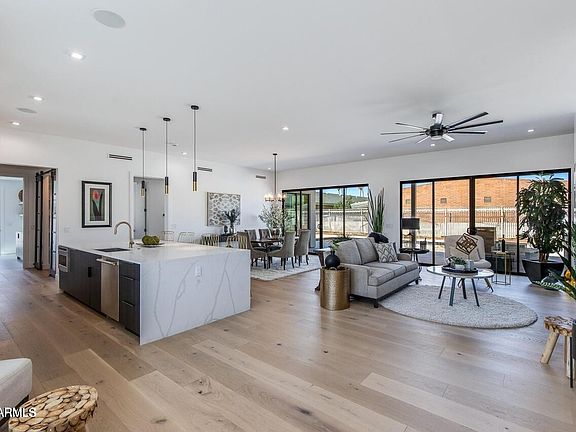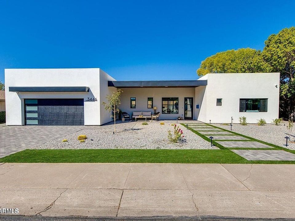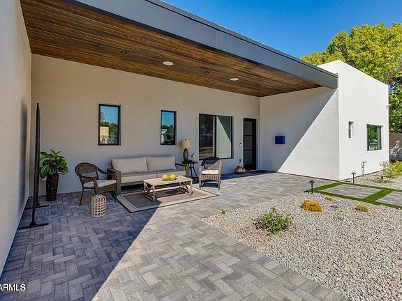 Architect-Designed Home in the heart of Arcadia now being offered as a luxury rental opportunity. This property is a 2024 modern new build, meticulously constructed and designed by an architect from the ground up, blending organic neutral colors that complement the desert throughout. Nestled within top-tier school districts and surrounded by endless entertainment options and restaurants, you'll also enjoy views of Camelback Mountain right from your front door. Inside, you'll be captivated by the gourmet kitchen, where vertical subway tiles elegantly line the walls and backsplash. The kitchen flows effortlessly into the inviting living and dining room, anchored by a beautiful floor-to-ceiling fireplace mantel that houses a built-in smart picture frame TV. The split floor plan hosts a primary suite with a hallway leading from sleeping and lounge area to its double sink vanity, stand alone tub, stand up shower with multiple shower heads, and a large walk-in closet with built-ins. The guest suites front window captures mountain views, a walk-in closet and full bath. Be the first to live in this brand-new build.