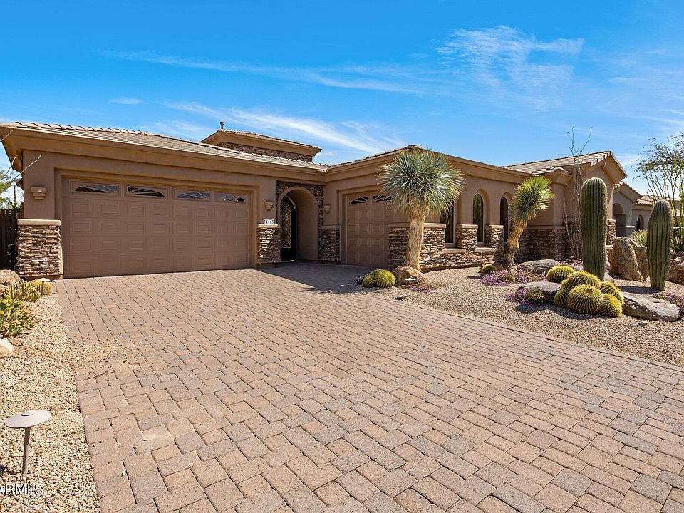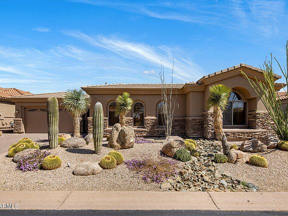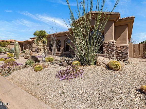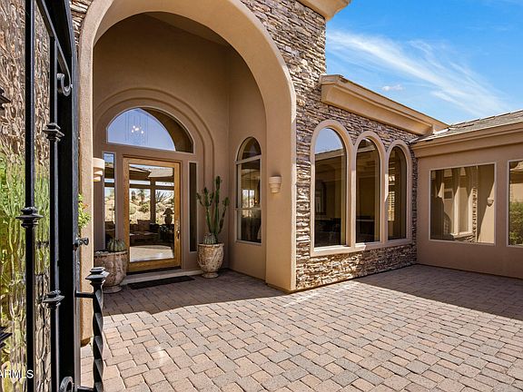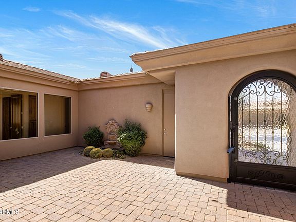Welcome to this beautiful residence nestled within the prestigious gated community of Legend Trail. This warm and inviting home offers 3 bedrooms and 3.5 baths. As you approach, a stately iron gate opens to a serene private front courtyard with lush landscape and water feature.. On entrance, you will be greeted by an abundance of natural light streaming through the windows, offering picturesque views of the backyard oasis. The open concept floor plan features a charming fireplace with brick accents, and spacious living area. Large windows offer views of the sparkling pool, enticing you to unwind and enjoy indoor-outdoor living at its finest. Both the front and back of the home include desert landscaping ideal for low maintenance and lock and leave lifestyle. The kitchen has been built