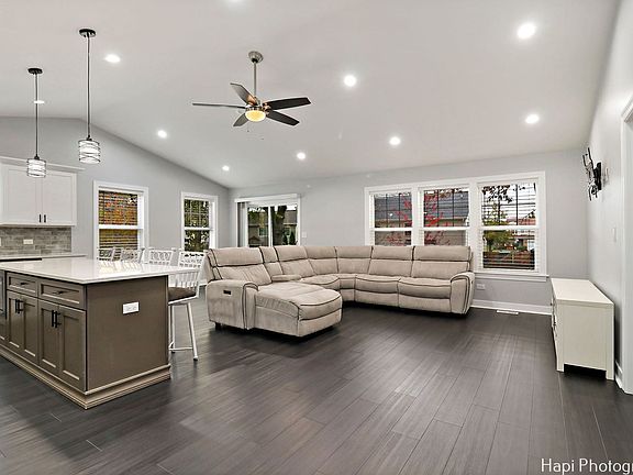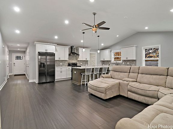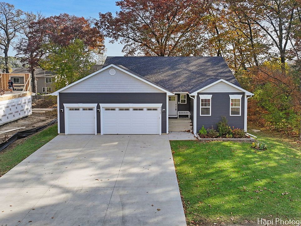 This beautifully constructed home (2021) combines contemporary design with low-maintenance living, providing you with a turnkey experience. Upon entering, you're greeted by a spacious, open floor plan filled with natural light, perfect for both relaxing and entertaining. The gourmet kitchen is a standout feature, boasting quartz countertops, stainless steel appliances, and a large island that serves as a gathering spot for family and friends. The main living spaces feature durable hardwood flooring, enhancing the home's warmth and elegance while ensuring easy upkeep. Each of the three bedrooms offers ample space, with the primary suite providing a quiet retreat complete with a custom-tiled en-suite bathroom. Thoughtful layout details make this home adaptable to any lifestyle, providing both comfort and privacy. Enjoy Peace of Mind with New Construction! Major systems, from the roof to the HVAC, are all new, minimizing maintenance needs and maximizing your enjoyment. This home is designed for years of worry-free living, freeing you to focus on creating lasting memories. The spacious three-car garage offers room for vehicles, storage, and projects, adding convenience to your daily routine. The outdoor space completes the experience, featuring an elevated deck that overlooks a tree-lined backyard-perfect for morning coffee, evening unwinding, or weekend gatherings. Situated in a serene neighborhood near lake access, this property combines modern living with outdoor enjoyment, making it ideal for those seeking both convenience and tranquility.