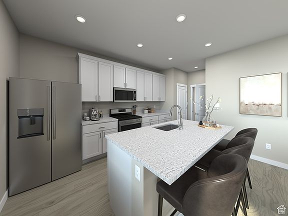 Brand new, energy-efficient home available by Oct 2025! This three bedroom home has an open-concept kitchen and great room perfect for entertaining. The primary bedroom provides a spacious walk-in closet for all your fashion needs. Move in ready with washer, dryer, fridge and blinds throughout included! Unfinished basement included. Total home approx. sq. ft. 2,339. Now selling in the growing Eagle Mountain, Juniper at Harmony has move-in ready homes include a washer, dryer, fridge, and whole home blinds. With our 60- day Closing-Ready Guarantee, you'll be reimbursed up to $5,000 in expenses related to delays we cause. Enjoy this masterplan community with parks, a clubhouse, and tennis & pickleball courts. Plus, all floorplans come standard with spray foam insulation and an unfinished basement. Each of our homes is built with innovative, energy-efficient features designed to help you enjoy more savings, better health, real comfort and peace of mind.