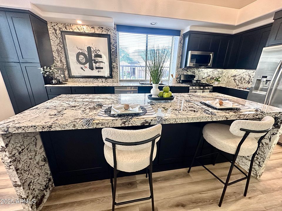 Low-maintenance landscapingGranite waterfall islandDramatic backsplashSoaring light-filled spacesLush corner lotRich finishesNew designer kitchen