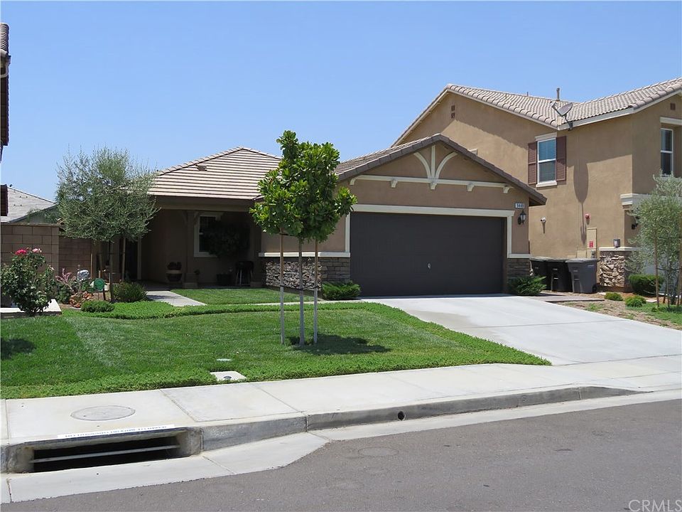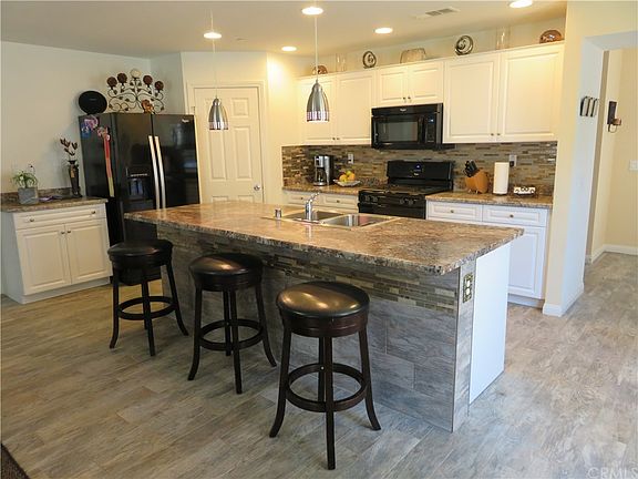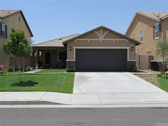 Country Charmer! Exceptional Single Story Home at Monument Park in Perris. This inviting floor plan offers an expansive kitchen combined with great room and dining area. The kitchen is beautifully upgraded with white Thermofoil cabinetry, gourmet center island with pendant lighting, breakfast bar, dual basin sink, and black Whirlpool appliances. You will love the amenities this home has to offer including neutral tile flooring and carpeting, custom paint & draperies, recessed lighting, raised panel interior doors, security system, and plenty of cabinet storage in the garage. Secluded master suite, dual sink vanity and oversized walk-in closet. Laundry room is conveniently located next to the spacious secondary bedrooms. Front and backyard is professionally landscaped with automatic sprinkler system. Backyard area offers a manicured grass area for outdoor activities along with a covered patio, ceiling fan and extensive concrete decking. Save money on your electric bill! This home was built with the latest energy efficient tankless water heater and Solar system by SunPower. You own the Solar system! Centrally located for Riverside, San Bernardino and North San Diego commuters. Only 10 minutes to the 215 freeway. Close to shopping, parks, medical facilities and Lake Perris. This home is meticulously maintained and ideal for first time home buyer's.