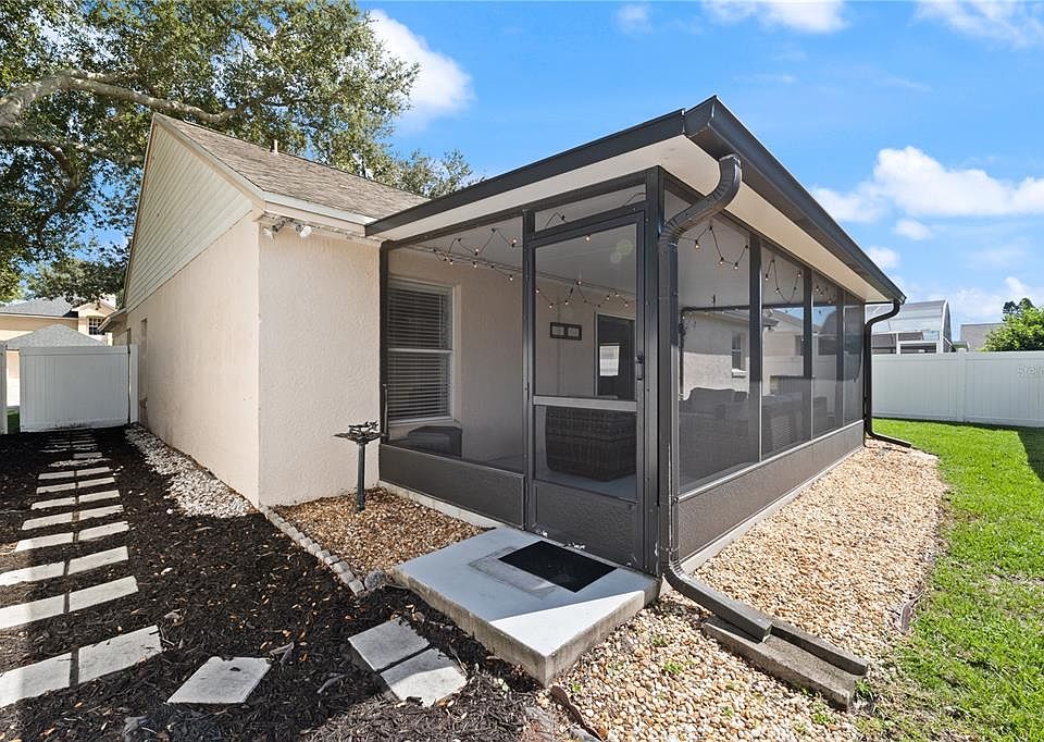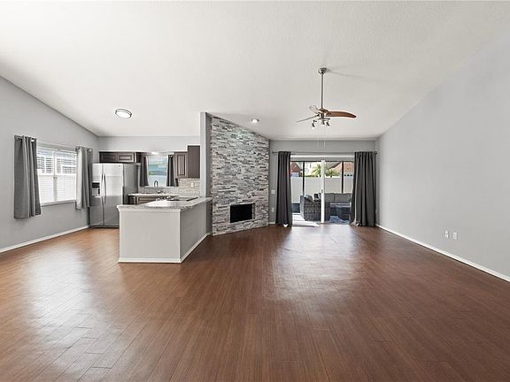 One or more photo(s) has been virtually staged. Upon entering, you’ll immediately notice the soaring vaulted ceilings in the family room, creating an open and airy atmosphere. A cozy fireplace adds warmth and character to this central gathering space, ideal for relaxing or entertaining. The kitchen is complete with solid-wood cabinetry, great countertop space for food prep and cooking, updated appliances and nicely sized dining area. The neutral paint and flooring throughout provide a fresh, clean slate, allowing for effortless personalization. The split floor plan is an added bonus with 2 bedrooms and a bathroom on one side of the home and the primary suite on the other side of the home. The primary suite features a walk-n closet with built-in shelving and a large bathroom with double sinks and a walk-in shower and is the perfect space to unwind and relax with after a long day. The fully fenced yard is perfectly manageable and features a large screen enclosure perfect for relaxing. New roof (2020), new screen enclosure (2020), New HVAC (2023), new garage door (2023) New carpeting (2025). The Ventura Community features a beautifully maintained 18-hole golf course designed by Mark Mahanna, a pro shop, a driving range, and the popular "19th Hole" restaurant. Community amenities include a newly renovated clubhouse with dining and fitness facilities, three community pools, tennis and pickleball courts, walking and biking paths, and scenic views of Lake Frederica from the community dock. Conveniently located near downtown Orlando and the airport, this home offers the best of comfort, recreation, and location. Call for your showing today!