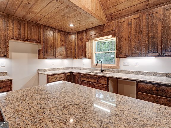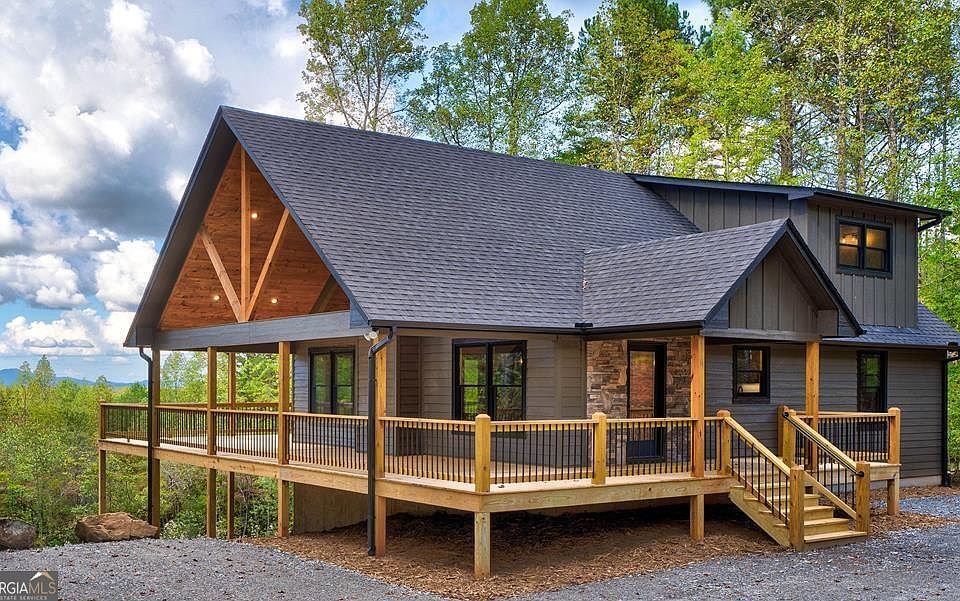 This traditional craftsman new construction with a long-range mountain view is nestled on a quiet, paved road with level terrain located 15 minutes from downtown Blue Ridge. This 4-bedroom, 4-bathroom is built in the traditional Craftsman style, every detail reflects quality craftsmanship and thoughtful design. The exterior is a painted engineered wood siding with low maintenance. There is a spacious, open-concept layout with premium finishes throughout, including granite countertops, elegant fixtures, and rich wood accent walls as well as circle sewn wood ceilings. The main level features the primary ensuite bedroom, complete with a luxurious tile shower with a view and upscale finishes. Two of the four bedrooms are ensuites, offering privacy and comfort for guests or family members. In total, the home includes three custom tile showers and an additional bath with a tile surround, blending function and style. The indoor stone fireplace is perfect for cozy mountain evenings, or take in the scenic views from the outdoor fireplace. The main-level laundry room adds convenience, while the terrace level features a wet bar and is pre-wired for a hot tub, offering future potential for relaxation or entertainment. The kitchen is outfitted with stainless steel appliances, granite countertops, and ample custom cabinetry. There are also two owner's closets and a mechanical room located on the terrace level.