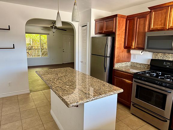 Inside, you'll find beautiful hardwood floors throughout, tile in the kitchen and bath, and thoughtful upgrades that elevate the space. The kitchen features granite countertops, stainless steel appliances, and a versatile island ideal for cooking or entertaining. An arched doorway adds architectural charm, connecting the kitchen to the bright, open living area.