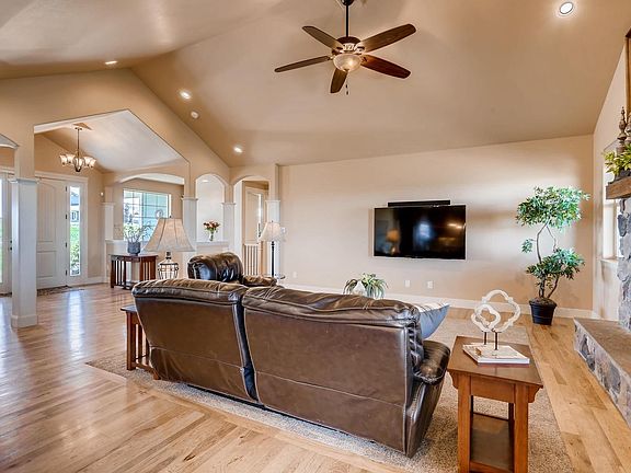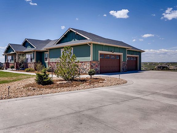 Custom Walk-Out Ranch designed with the Casual Colorado Lifestyle in mind! Situated on 5 acres in Parker subdivision of Elkhorn Ranch, views from Mt Evans to Pikes Peak are breathtaking! Enjoy sunsets from the west facing deck featuring indoor/outdoor gas fireplace, as you toast marshmallows over a fire pit or catch your favorite sports event on TV. Retreat to the kitchen, a chef's delight, with oversized granite island for food prep and gathering for entertaining family and friends. Adjoining family room is filled with light from vaulted ceilings and open floor plan. Lower level game room has a wet bar and space for multiple game tables. The exercise room has a rubber floor. 3 Bedrooms have large windows for front range views. The work/storage area is a dream for the handy man.The garage accommodates all the cars and toys for a front range lifestyle:bikes, ATVs, boats, and more! If horses are your passion, bring them! View the Matterport for a more complete experience!