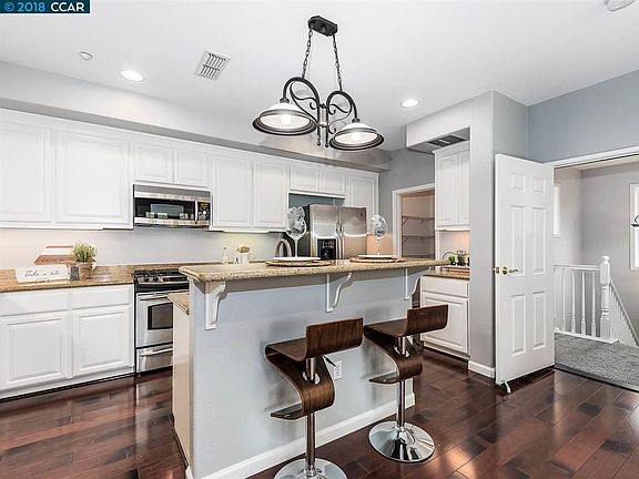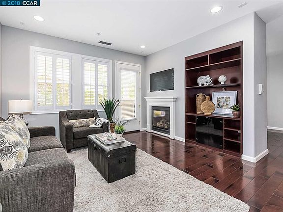 Modern and contemporary townhome with spacious and openflow living space. The living room features a gas fireplace, built-in shelving and private outdoor balcony. Downstairs has beautiful engineered hardwood floors throughout and plush carpeting in the downstairs bedroom and hall. The kitchen features ample cabinet storage, granite counters, breakfast bar, large walk-in pantry, stainless steel appliances including gas range stove, built-in microwave and refrigerator. There is a full bedroom and bathroom on the main living floor. Upstairs has a master suite with extensive master bath and generous closet space. The 2nd upstairs bedroom is a semi-master suite with it's own full bath attached. Downstairs is a full laundry room with washer/dryer included. There is a finished, large 2 car tandem garage. Great location with easy access to 580/680, BART station/public transit, shopping, restaurants and parks. Courtyards at Dublin Ranch Villages includes pool, clubhouse, gym, parks!
