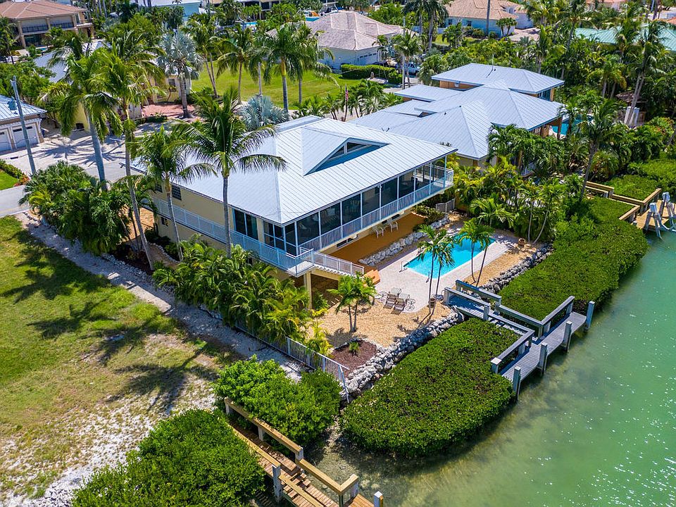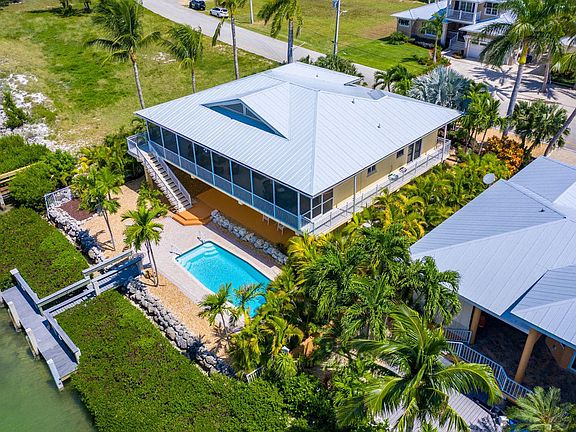 SPACIOUS two story home at the end of 13th Street with beautiful open water views. Constructed for Keys living, concrete, impact windows and brand new metal roof, waterside screened porch that runs the entire length of the house overlooking the pool and dock. Updated kitchen with granite and stainless, 16kw generator with 500 gallon propane in ground tank, tiled garage/workshop. Plantation shutters inside on the windows and sliding glass doors.Dual zone A/C for upstairs and down. Right at Vaca Cut for ease to both the ocean and bay. Dock is also newly decked with composite decking set on concrete pilings. The only thing this house needs is YOU!
