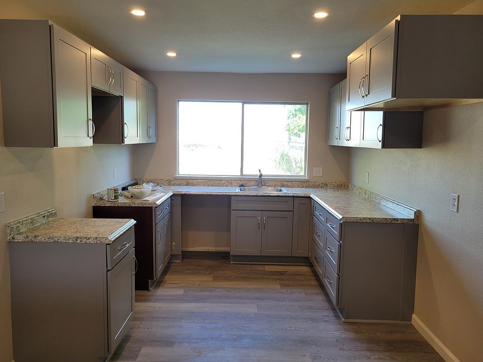 Completely remodeled 2 bedroom with 1 bath on 1st floor of fourplex, including new kitchen cabinets, counters, appliances, 100% waterproof LVP flooring throughout (no carpet), new lighting, dual pane windows, sliding doors, paint, bathtub, toilet, vanity, sink and much more! All work completed by a licensed contractor. Central heating and air, fenced backyard and parking on property. Tenant pays PG&E, no pets and no smoking.