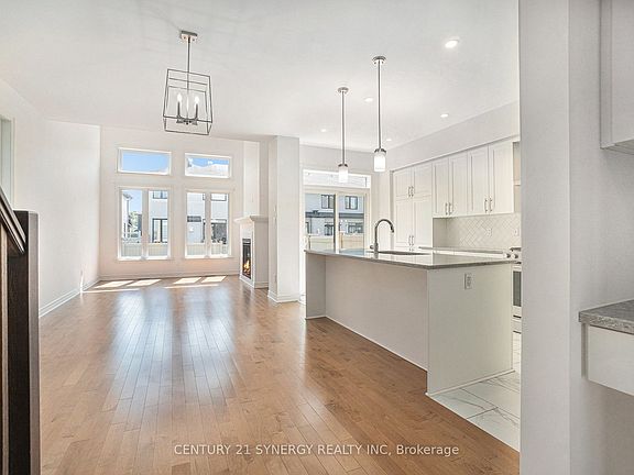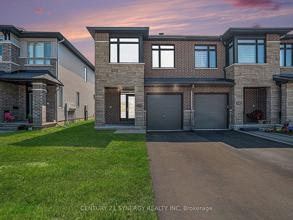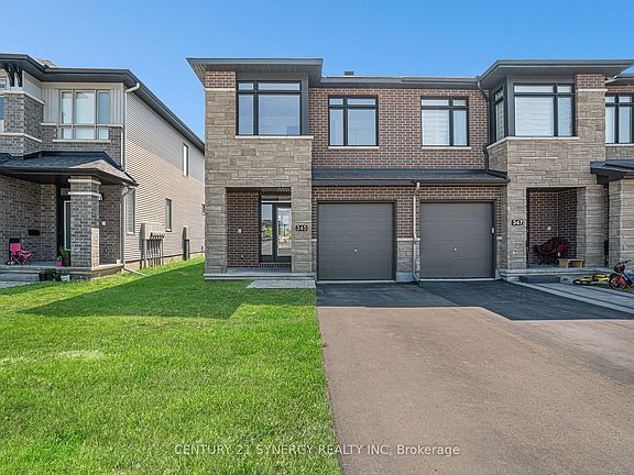 Welcome home to this spectacular Richcraft Executive End-Unit Townhome, where luxury meets comfort in every detail. From the moment you arrive, the curb appeal sets the tone for the elegance inside. The main floor boasts a spacious foyer, clad in large tiles with an oversized closet, a stylish powder room, and inside access to the garage. Step into the bright open-concept living and dining space, flooded with light from the extra windows this end-unit has, highlighted by soaring two-storey windows and an impressive 18-foot ceiling. Warm hardwood floors lead you to a cozy gas fireplace with a custom tiled surround, while the upgraded chefs kitchen steals the spotlight with full-height custom cabinetry, extended pantry, quartz countertops, sleek tile backsplash, gas stove with griddle, stainless steel appliances, and an oversized island with seating for four. Upstairs, the primary suite is a private retreat featuring a large walk-in closet and spa-inspired ensuite with quartz vanity, glass shower, and soaker tub. Two additional bedrooms, a full bathroom, and a convenient laundry room complete the second level. The fully finished lower level offers a large versatile family room, perfect for a home gym, playroom, or rec space, with plenty of storage. Outside, enjoy the fully fenced south-facing backyard with extra space and shade provided by this premium end-unit location with no front neighbours. Recent upgrades include LED lighting, dimmer switches, and interlock. With a beautiful park just steps away, new schools around the corner, and a home that feels brand new, this one won't last long, book a showing today!