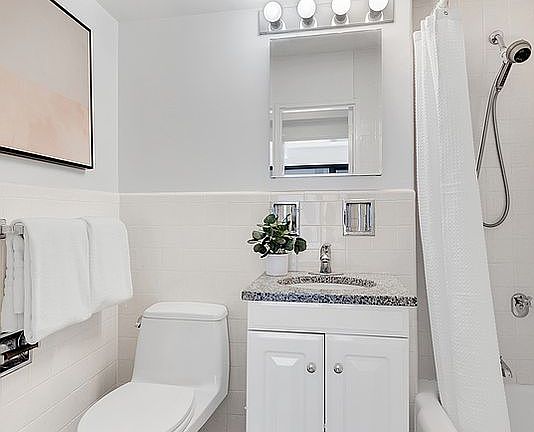 The bathroom is a luxurious retreat with white tiled walls and shower, a large tub shower, and Toto toilet. Before entering the bathroom, your own closet area provides space for a dresser and closet for all your clothing.