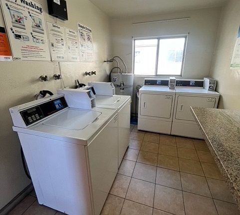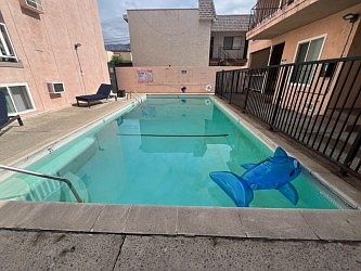 This unit shows a similar unit with renovations, with granite kitchen countertops, stove, microwave, laminate vinyl wood-tone flooring, wall AC's in living room and bedroom, ceiling, fan, wall-to-wall bedroom closets, Beautiful bathroom with tile backsplash, vanity, blinds throughout unit, ceiling, fan, New paint and pool. Gated carport parking and laundry on site.