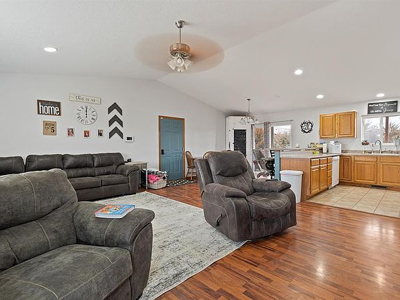 Nice ranch style home in quiet small town! This home has all you need with 3 bedrooms, 2 full bathrooms, walk in closet, attached 2 car heated garage, and central air all on a large corner lot! Open floor plan with breakfast bar, recessed lighting, and vaulted ceiling. Patio doors off dining room to the covered back deck and fenced back yard. Lots of extra parking.