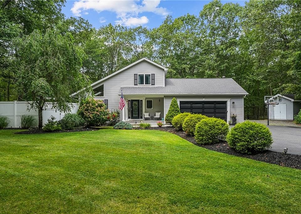 **OPEN HOUSE CANCELLED!** Escape to your own private retreat with this stunning 3-bedroom, 2-bath contemporary home set on 4.22 serene acres. A gated driveway welcomes you to this thoughtfully designed residence, where cathedral ceilings, skylights, and walls of natural light create a bright and airy ambiance. Inside, elegant floors, granite countertops, and stainless steel appliances bring modern luxury, while radiant heat, central air, and a cozy fireplace ensure year-round comfort. The fireplace tile surround has just been updated and is not reflected in the photos. The main level offers the convenience of a first-floor bedroom, while a striking spiral staircase adds architectural charm and leads to two additional bedrooms with vaulted ceilings for an open, spacious feel. The finished lower level expands your living space with an additional 1,096 square feet, complete with a walkout and a dedicated laundry room—perfect for entertaining, hobbies, or flexible living. Step outside to enjoy a deck with a sunken space and hookup ready for a future hot tub, or gather around the outdoor firepit on cool evenings. An oversized two-car garage and a storage shed provide plenty of space for vehicles, tools, and equipment. Privately tucked away in a wooded setting, this home offers the perfect blend of luxury and tranquility—yet is just minutes from modern conveniences. Don’t miss this rare opportunity to make it yours!