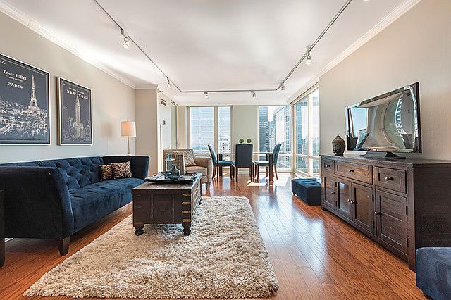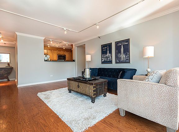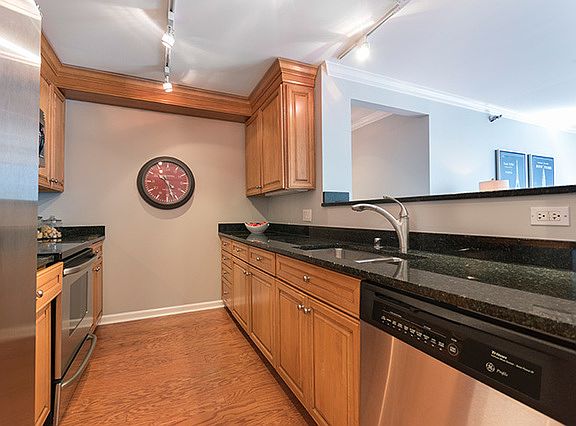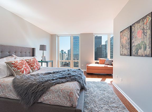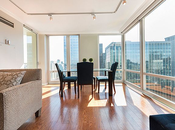 One floor below the penthouse, this mint condition southeast corner 1,320 sqft condo is ideally located close to Michigan Avenue, River North, and the Loop! A dedicated foyer welcomes you. The living/dining room face east; floor-to-ceiling windows offer skyline views with a peak at the river and the lake. The balcony is ideal for watching the sun rise and a barbecue grill. The kitchen has cabinets to the ceiling, stainless appliances, and ample granite counters. Other features include track lighting, fresh paint, and new engineered wood floors. There are 2 bedrooms, 2 baths including a master with an en suite bath and a large walk-in closet with custom organizers. Hook-ups for a washer/dryer are conveniently located in the bath closet. The Sterling is a full service building with 24-hour door staff, onsite manager, fitness center, and sundeck with pool, tennis court and dog run. Garage parking is available for $289/month (unassigned) and $400/month (assigned).