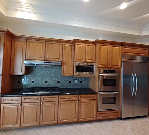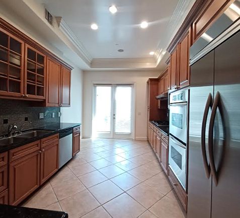 The chef's kitchen is a dream complete with stainless steel appliances, including a double oven, cooktop, dishwasher, microwave, and refrigerator all designed for both function and style. The layout flows effortlessly to a large private patio, creating an ideal indoor-outdoor lifestyle for entertaining or relaxation.