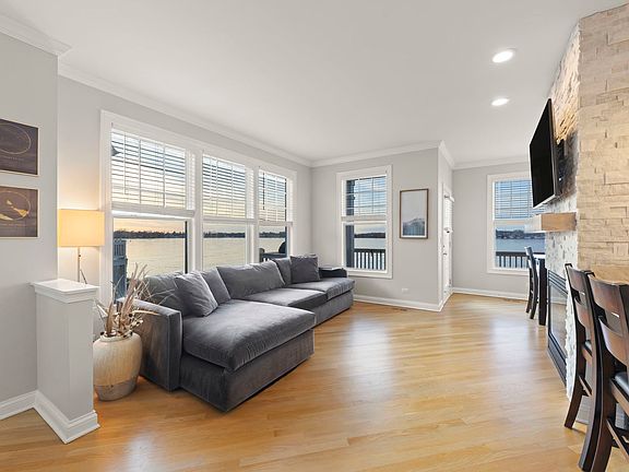 Welcome to 345 Sundown Court, Unit C, Wauconda, IL, where luxury meets waterfront living. This stunning 3-level home boasts 2 bedrooms and 3.5 bathrooms, each bedroom featuring an en suite for ultimate privacy. Recently updated with high-end finishes, this residence offers breathtaking water views from every room. The open-concept main floor showcases a 2022-redone galley kitchen, complete with Taj Mahal quartzite countertops, custom cabinets, floating shelves, and top-of-the-line Viking stainless steel appliances. The entire home has been freshly painted within the last three years, and the main floor features beautifully refinished hardwood floors. Relax by the gorgeous brick fireplace, surrounded by elegant wainscoting along the staircase. The primary bathroom, updated in 2023-2024, offers heated floors, an oversized shower, a new vanity, and an anti-fog lighted mirror. Step outside to enjoy two expansive decks crafted with durable TREX material, perfect for entertaining or soaking in the serene waterfront views. The remodeled basement, completed in 2021, includes a bar and entertainment area with custom cabinets, granite countertops, and wine and beverage refrigerators. Additional amenities include a 2-car garage with a new door system, and a convenient laundry area with washer and dryer hookups. Residents of Sunset Ridge enjoy access to a private boat dock on Bangs Lake, with opportunities for fishing and other waterfront activities. Explore the vibrant downtown Wauconda and its array of dining and entertainment options, all just a short distance away. Welcome to your dream waterfront home!