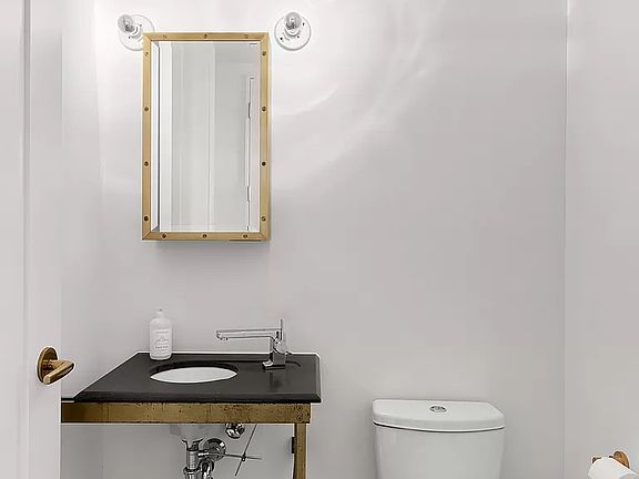 The primary bedroom suite is a tranquil retreat with a walk-in closet and a luxurious five-fixture bathroom. The bathroom is a masterpiece, featuring a glass-enclosed wet room adorned with oversized slabs of Spanish Travertine Marble. You'll also find a deep soaking tub with a Spanish Travertine surround, a solid brass vanity with a granite countertop, Dornbracht fixtures, and custom brass wall sconces.