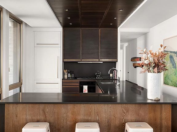 A chef's dream, the artisan-crafted kitchen is adorned with custom oak millwork, bronze accents, and honed Absolute Black granite countertops and backsplashes. High-end Dornbracht fixtures complement the fully equipped kitchen, which includes a 36-inch Sub-Zero Fridge, a 36-inch Wolf cooktop, a 30-inch Wolf oven, an under-counter Sub-Zero wine cooler, and a Bosch dishwasher.
