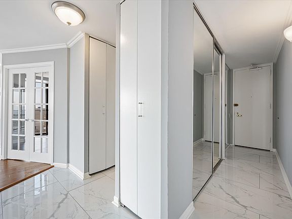 Experience breathtaking panoramic south, east, and west views of the Chicago skyline and Lincoln Park from this beautifully updated 2-bedroom, 2-bath residence at 345 Fullerton. Designed for both comfort and style, the home features hardwood and quartz floors, a white kitchen with new stainless steel appliances, stone countertops and island seating, plus refreshed bathrooms with marble and quartz finishes and new vanities. The primary suite offers a spacious walk-in closet, while the second bedroom-set off the living room with French doors-provides flexibility for a guest room, office, or den. Enjoy the full-service building with 24-hour security, fitness center, outdoor terrace with grills, and rental parking available. Step outside your front door to enjoy convenient bus access, the Lincoln Park Zoo, lakefront trails, green space, and all that city living has to offer.