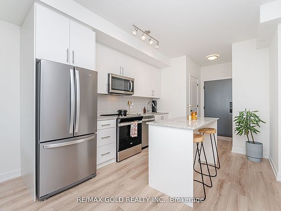 Welcome to North Oak at Oakvillage! This modern 1-bedroom, 1-bath condo offers 616 sq ft of stylish living space with parking and locker included. The kitchen boasts granite counters, backsplash, breakfast bar, and stainless steel appliances. Bright open-concept layout with laminate flooring throughout and a walk-out to a private balcony. The spacious primary bedroom features a walk-in closet and floor-to-ceiling window. Internet is included In the Maintenance Fee. Fantastic location at Dundas &Trafalgar, close to shopping, transit, schools, and parks. A perfect blend of comfort and convenience in one of Oakville's most sought-after communities.