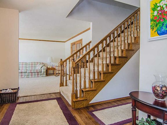Inviting hardwood foyer leads to eat-in kitchen featuring lg snack bar, abundance of cabinets & built-in desk. Dining w/patio doors leading to deck in beautiful wooded backyard. Cozy family room w/floor to ceiling brick gas fireplace & wood beam ceiling w/french doors leading to light & bright living room. FF office/den, laundry. Upper features master w/walk-in closet, private full bath w/dual sinks & jetted tub, 3 spacious secondary bedrooms & additional full bath. LL rec room & bar area. 6 panel doors & tons of storage throughout. 3 seasons room. Newer roof & furnace.