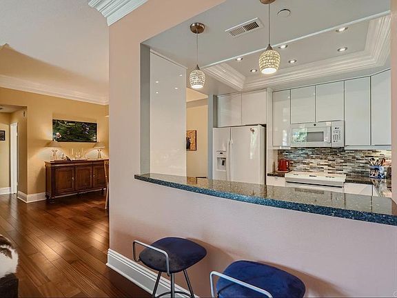 Sophisticated elegance in Banker's Hill at the upscale, secured community of Le Parc Chateau. Beautifully renovated unit with open living and dining rooms with soaring 10’ ceilings. These areas are flanked by two spacious bedrooms and bathrooms. The modern kitchen has quartz counters, sleek appliances, and a built-in bar seating area which overlooks the treetops. This 4th floor southeastern exposure corner unit, offers two balconies to enjoy morning coffee, bird watching and water views. The home also features stunning wood floors, W/D in unit, fireplace, closet organizers, ample storage, plus two underground parking spaces. Building amenities also include a elevator, community room, garage storage room and pool. Le Parc Chateau sits in a highly desirable area, conveniently located near Balboa Park, Bankers Hill & Hillcrest!