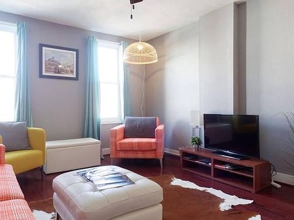 This one-bedroom, one-bathroom apartment is one block from the Avenue in Baltimore's Hampden neighborhood. It has a dedicated parking space,