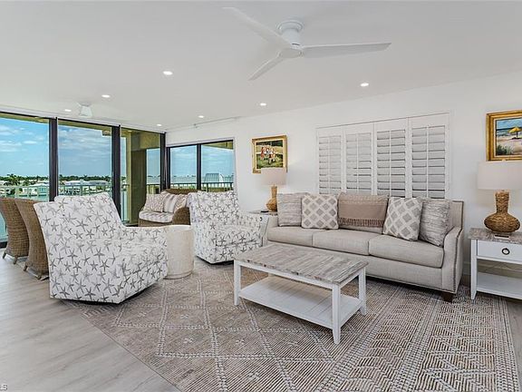 WOW! The view of the Bay from the 5th floor is huge! There is a View of the GULF as well, from the Primary Bedroom. This is a FULLY REMODELED 3 Bedrooms and 2 Baths as of 9/2024!! All new appliances, TANKLESS Hot Water Heater, ROOF New as of 2020! Furniture all NEW Fall of 2024. Being sold FURNISHED. Community Guest Condo available for overflow Family and Friends. A Grilling Terrace with dual ends, each equipped with a Grill, is all NEW! Here you will find 6 tables and chairs so you can dine and watch the Boats and Dolphins go by! The Bay provides a Twinkling Nighttime experience with all the lights from the homes across the water and the Boats coming in. WALK to Venetian Villiage for Shopping, Dining, and entertainment. An Open, large Landing is found on the 5th floor for more relaxing and entertaining space! This building is elevated at 8'! NO WATER intrusion in 2022 storm! La Maison is a very friendly community of 64 residences. There is a great Social life here for all who want to participate! Book your showing now!