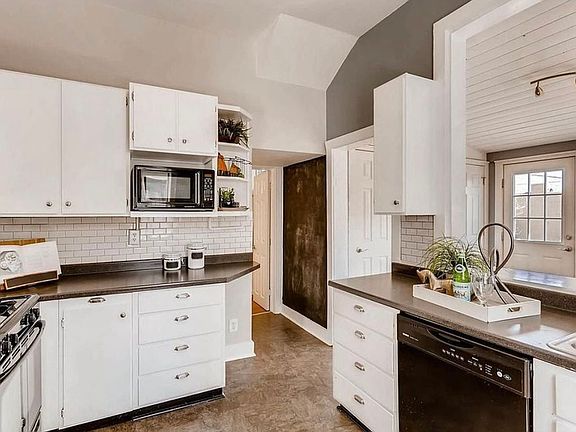 Tiled backsplash, clean white cabinets and separate pantry area in large kitchen. Full bath on main floor has updated vanity, storage, and mirror. Huge bedroom plus bonus area/living room on upper level. Two bedrooms on the main level off living room and dining room. Sun room near back of house has built in custom seating.