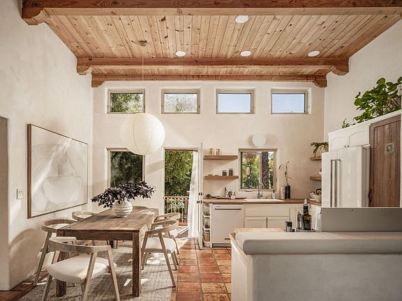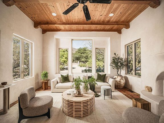 Located in Ojai's coveted East End, this Marc Whitman-designed compound unfolds across nearly 2 acres of flat, usable land. Framed by wide-open mountain vistas and Ojai's iconic pink moment, the property lives as a true compound, offering a collection of thoughtfully placed structures that support both connection and privacy.The 2-bed, 2-bath main residence carries a warm, Santa Fe-inspired design, with exposed beams, tall windows, and natural light that moves through an open interior layout. Nearby, a 1-bed, 1-bath pool house anchors the resort-style pool terrace, creating an easy setting for gatherings, wellness, or weekend guests. A separate 1-bed, 1-bath casita sits just beyond - ideal as a private guest suite, creative studio, home office, or multi-generational space.The grounds are generous and thoughtfully arranged, with mature fruit trees, raised garden beds,existing infrastructure for animals, and ample room for equestrian use or a small homestead. The result is a rare East End offering: versatile, quietly private, and set up to support a range of living styles, from everyday simplicity to multi-generational living.