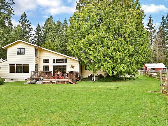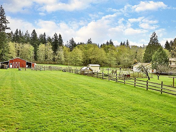 Private tree-lined drive brings you to sun-drenched pastoral 10+ acreage. Enclosed garden ready for transplanting seedlings raised in a potting shed. Established fruit trees and berry bushes. The barn offers flexible uses: 4 stables, workshop, gym. Chicken coop, woodshed, turkey house. 3-bdrm, main floor master home is filled with natural light, open floor plan, and meadow/pond views. Spacious deck for entertaining/relaxing. Very tranquil. Close to ferry. Call Suzanne Leisher at (425) 446-2380