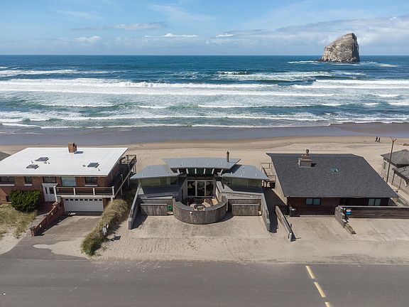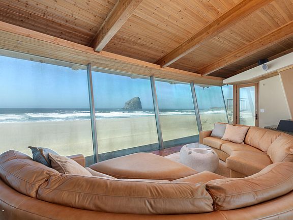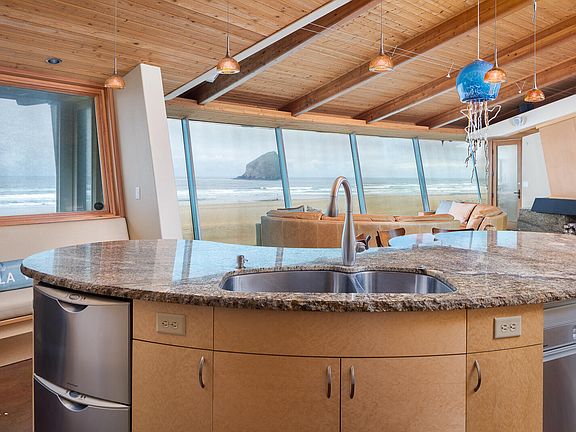 preserving privacy. Upon entry through a solid gate into a courtyard, the home unfolds to reveal an open family, living and kitchen space, adorned with floor-to-ceiling glass windows that embrace panoramic ocean views. Custom touches abound, from bird's eye maple cabinets to rough-hewn granite countertops and a hand-blown jellyfish chandelier illuminating the dining area. Outdoor living is seamlessly integrated, offering sheltered spaces to enjoy the coastal panorama while being shielded from ocean winds. With every west-facing window framing sand dunes, crashing waves, and the iconic Haystack Rock, this residence epitomizes the quintessential Oregon coastal lifestyle, where nature's grandeur meets architectural excellence. This is a once in a lifetime opportunity to own an oceanfront work of art.